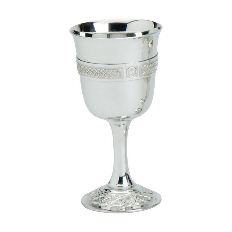 This is a traditional pewter chalice shaped wine goblet with traditional Celtic wire, stylish plain stem and ornate Celtic base made by Edwin Blyde. It is a stunning goblet made from solid pewter and individually hand made by us.