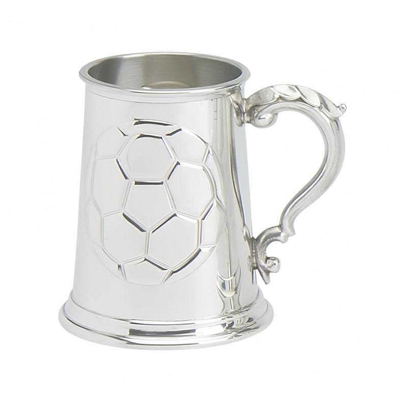 This is a 1 Pint Tankard with Solid Metal Base with our makers mark underneath.. There is a stylish football scene on the front with a ornate georgian handle and polished finish. It comes in a plain black box. This is an ideal gift for any occasion. It is individually hand made in our Sheffield factory by skilled craftsmen.
