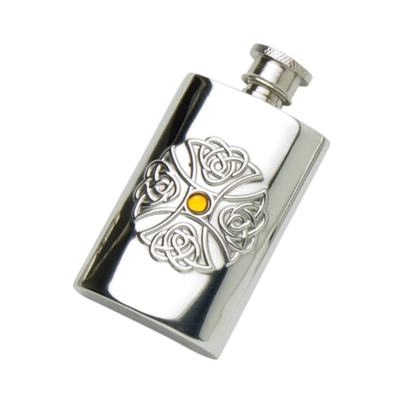This is a Stylish Pewter flask made by Edwin Blyde. It is a traditional kidney shape with embossed celtic cross design and glass topaz stone with the makers stamp underneath. It comes in a black presentation box with a black drawstring microfibre bag for protection, this bag is useful after purchase for safekeeping and cleaning.
