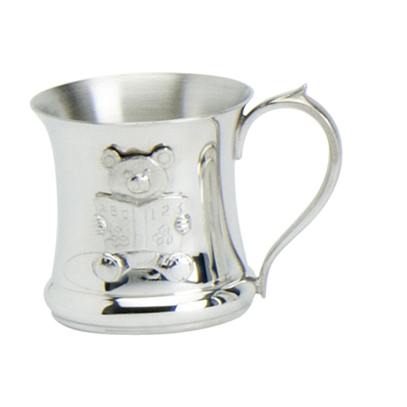 This beautiful handcrafted pewter childs can has been individually hand made by our skilled craftsman in our Sheffield factory. It comes in a polka dot gift box and would make an ideal gift for any occasion. it is a stylish Concave shape with Teddy Bear Mount and Ornate Handle