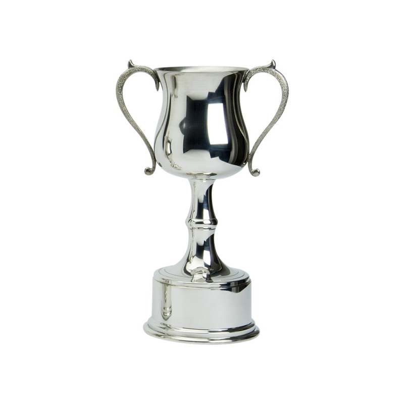 This is a Georgian style trophy - Pewter with a stunning design and patterned body. It has a tradition shaped handles and all over polished finish. It comes in a plain black box. This is an ideal trophy of any sporting occasion for schools awards to golfing presentations. It is individually hand made in our Sheffield factory by skilled craftsmen.
