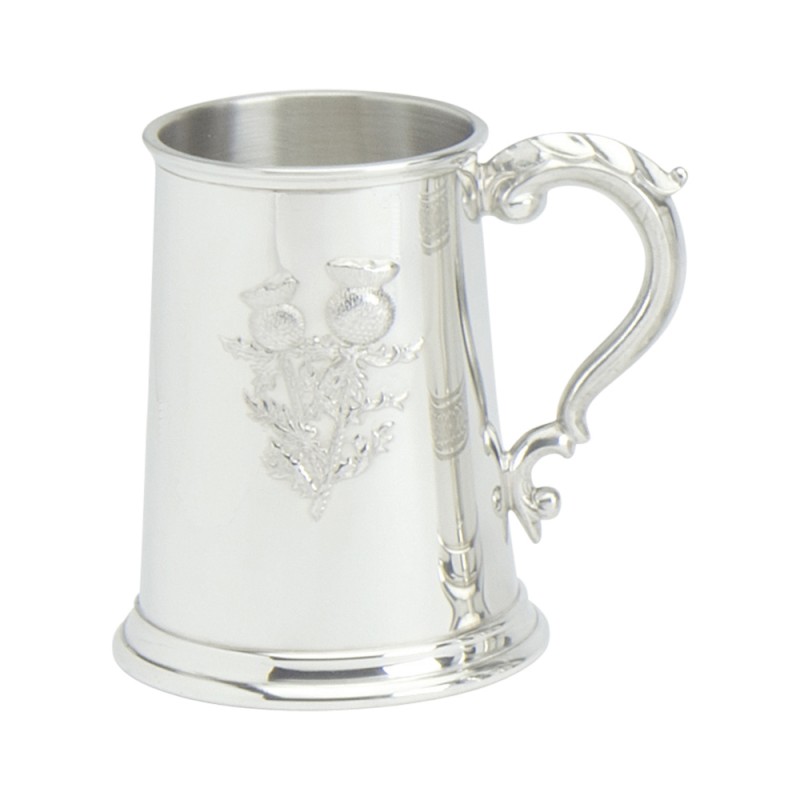 This is a 1 Pint Tankard with Solid Metal Base with our makers mark underneath. There is an embossed ornate thistle design on the front with an traditional georgian handle and polished finish. It comes in a plain black box. This is an ideal gift for any occasion. It is individually hand made in our Sheffield factory by skilled craftsmen.