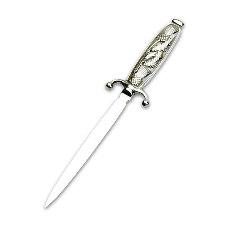 This is a Pewter and Stainless Steel Letter Opener made by Edwin Blyde. It has a flat Stainless Steel blade and a Stylish Thistle Design Pewter handle. A gift for the office, to treat yourself or to save time opening mail at home. Ideal gift for any occasion.
