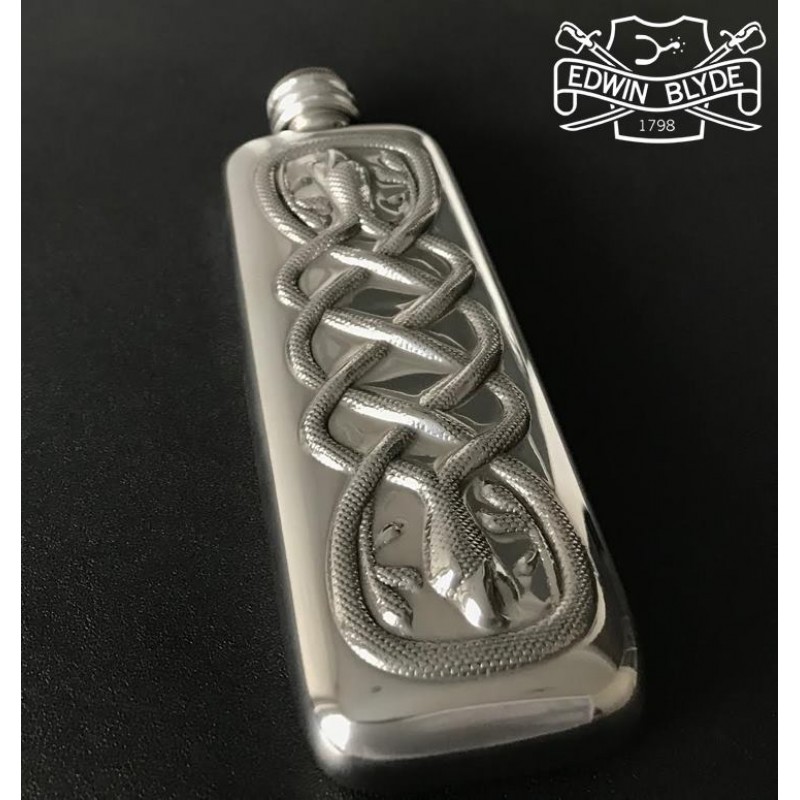 This is a Stylish Pewter flask made by Edwin Blyde. It is a boot flask with serpent design. Soft corner design with smooth edges. It comes in a black presentation box with a black drawstring microfibre bag for protection, this bag is useful after purchase for safekeeping and cleaning.