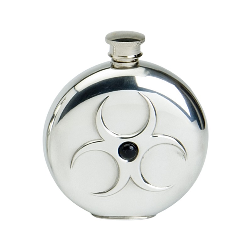 This is a Stylish Pewter flask made by Edwin Blyde. It is a traditional round flask with onyx stone hazard design with the makers stamp underneath. It comes in a black presentation box with a black drawstring microfibre bag for protection, this bag is useful after purchase for safekeeping and cleaning.