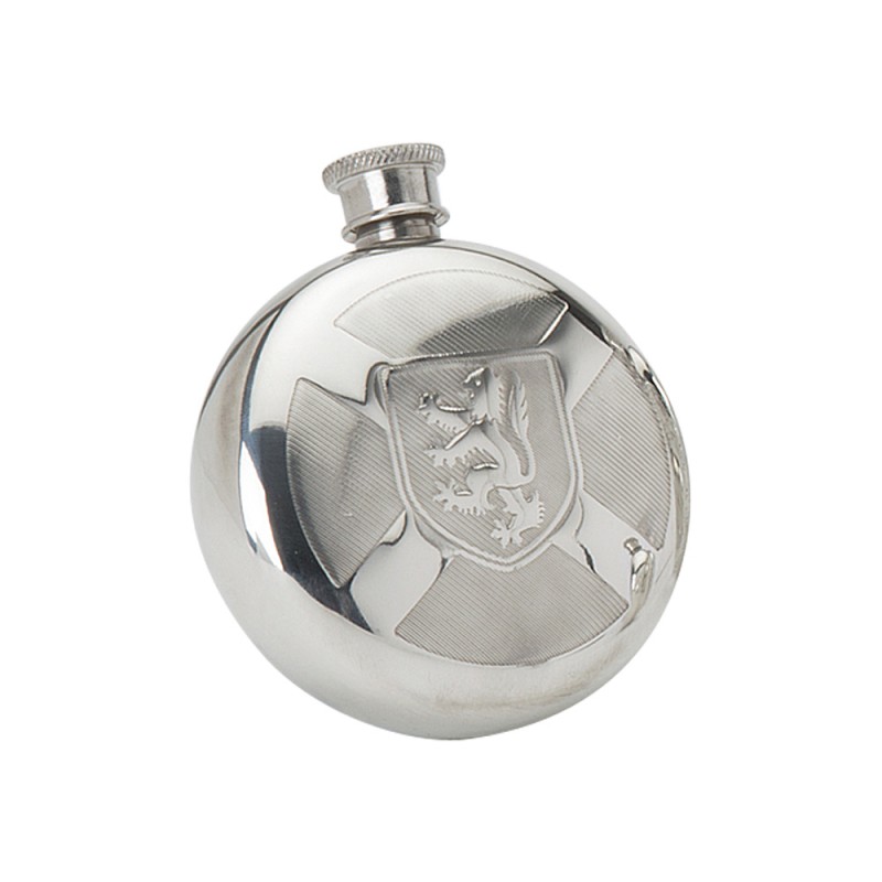 This is a Stylish Pewter flask made by Edwin Blyde. It is a traditional round flask with Scotland shield design. It comes in a black presentation box with a black drawstring microfibre bag for protection, this bag is useful after purchase for safekeeping and cleaning.